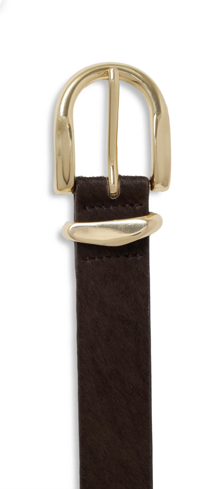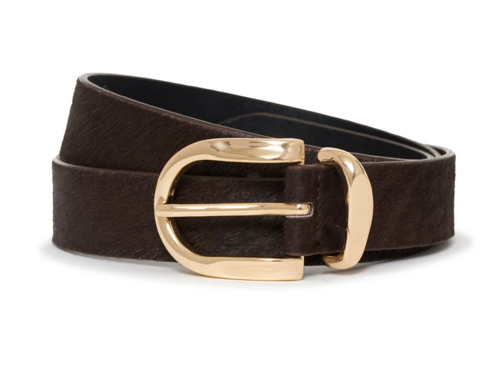 - The Sanctuary Clothing All Day Calf Hair Belt in Choco Brown features a dark brown calf hair finish and a shiny gold oval buckle.