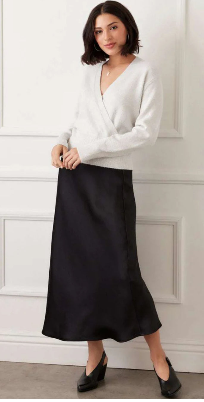 Elevate your knitwear with this effortlessly chic wrap-style sweater. Designed with a crossed V-neckline and slightly dropped shoulders, it creates a flattering silhouette that feels both modern and timeless. The subtle sequin detailing woven into the fabric adds a touch of shimmer, making it perfect for day-to-night wear. Finished with long sleeves and a wide ribbed band at the waist, this pull-on style offers a comfortable yet polished fit.
