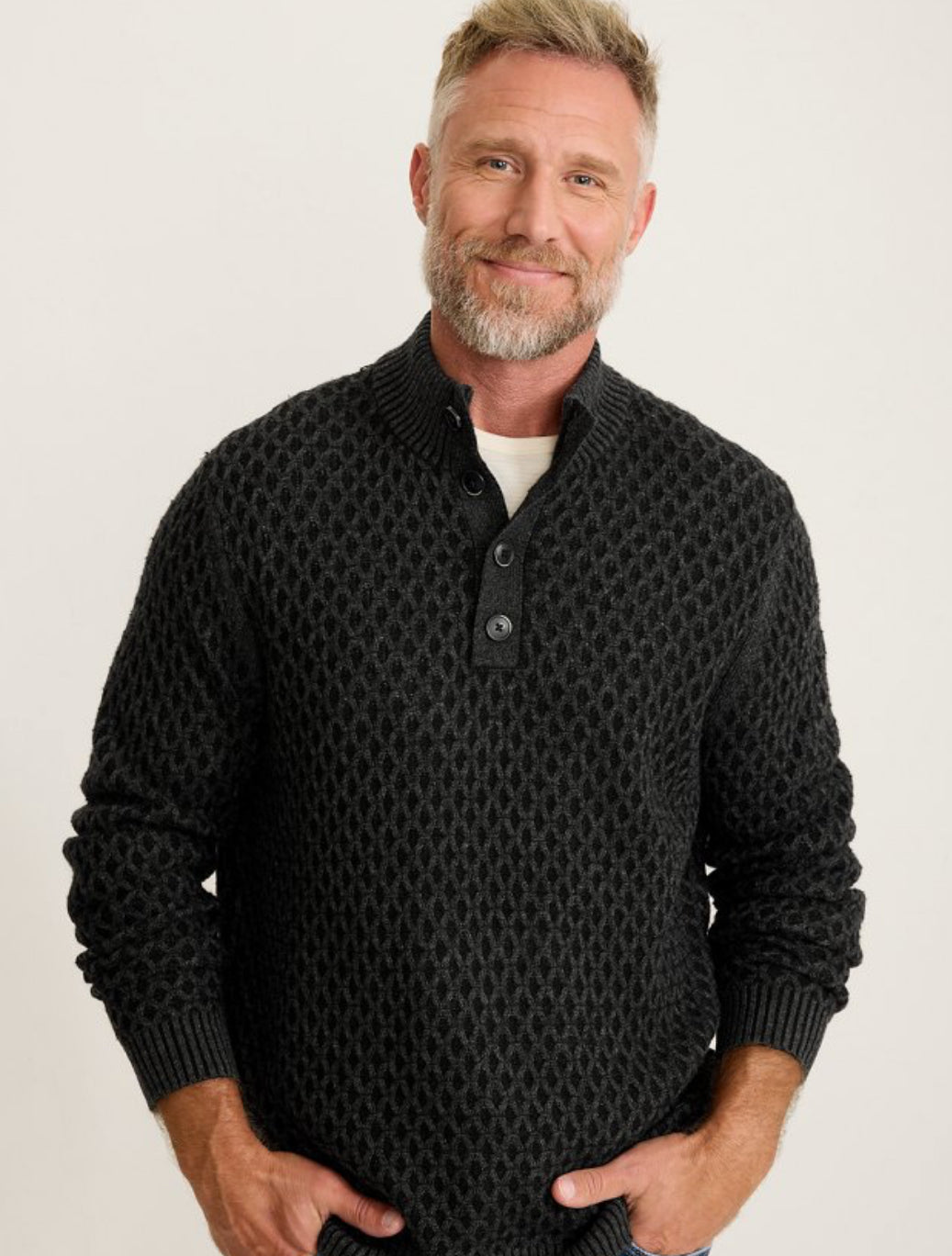Sophisticated appeal takes form in this cross-cable knit sweater, defined by elevated details like its charming button mock neck and ribbed trim.