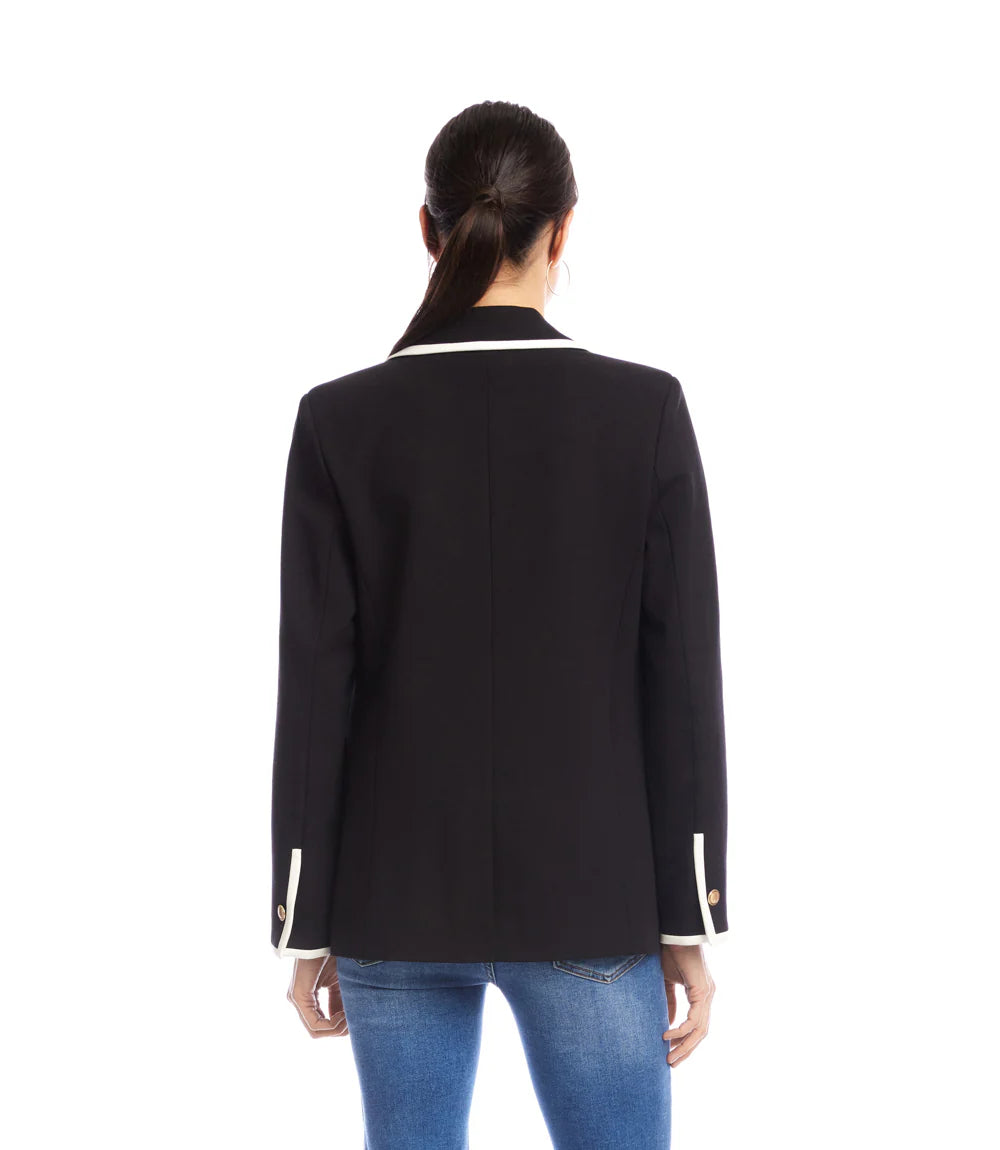 Crafted from stretch Ponte fabric, this blazer features sharp contrast trim along the collar, lapel, cuffs, and flap pockets for a crisp finish. Fully lined for a smooth fit, it’s detailed with long sleeves, a single-button front closure, gold-tone buttons at the cuffs, and two front flap pockets for a polished look.