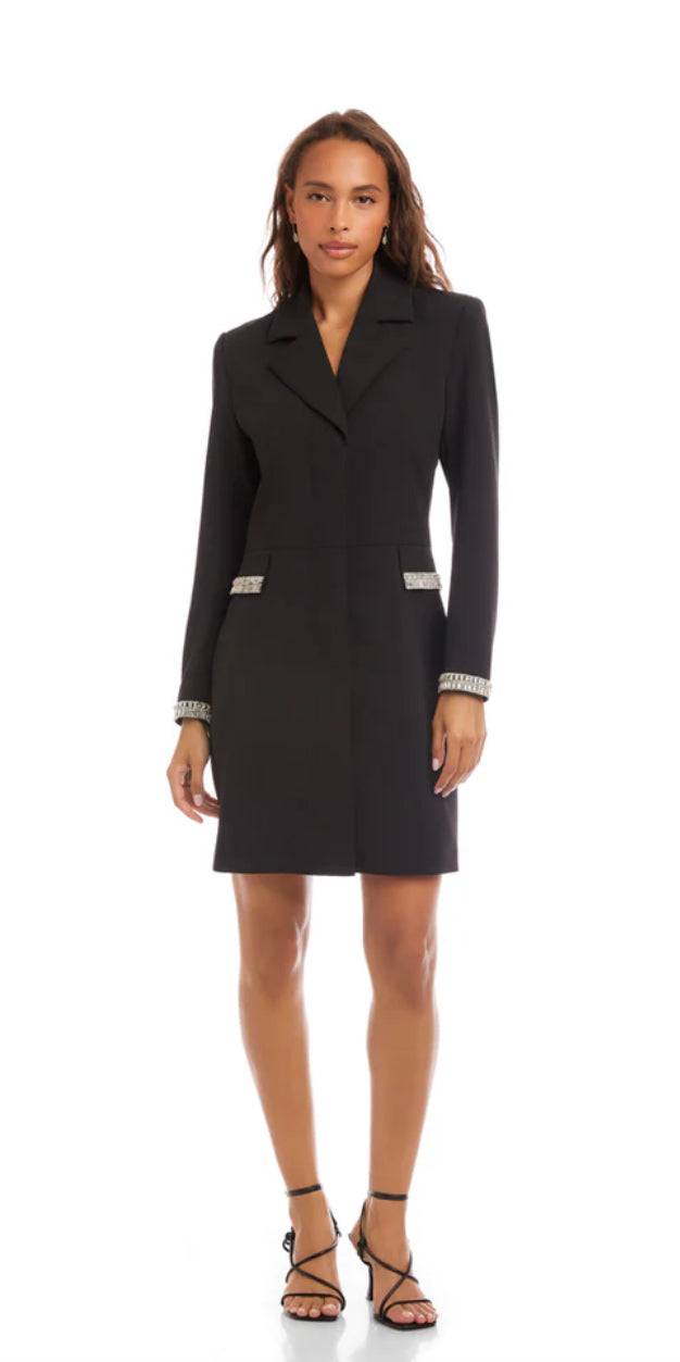 Sophisticated and sleek, this blazer dress is crafted in a crepe woven fabric and is fully lined for a smooth, comfortable finish. Designed with a sharp notched collar and elegant long, set-in sleeves, it delivers a refined, tailored silhouette. The look stays clean with an inner hidden closure, while two front flap pockets are accented with embellished gems, echoed at the cuffs for a touch of statement sparkle. Falling gracefully to the knee length, this piece blends timeless tailoring with modern evening glamour.