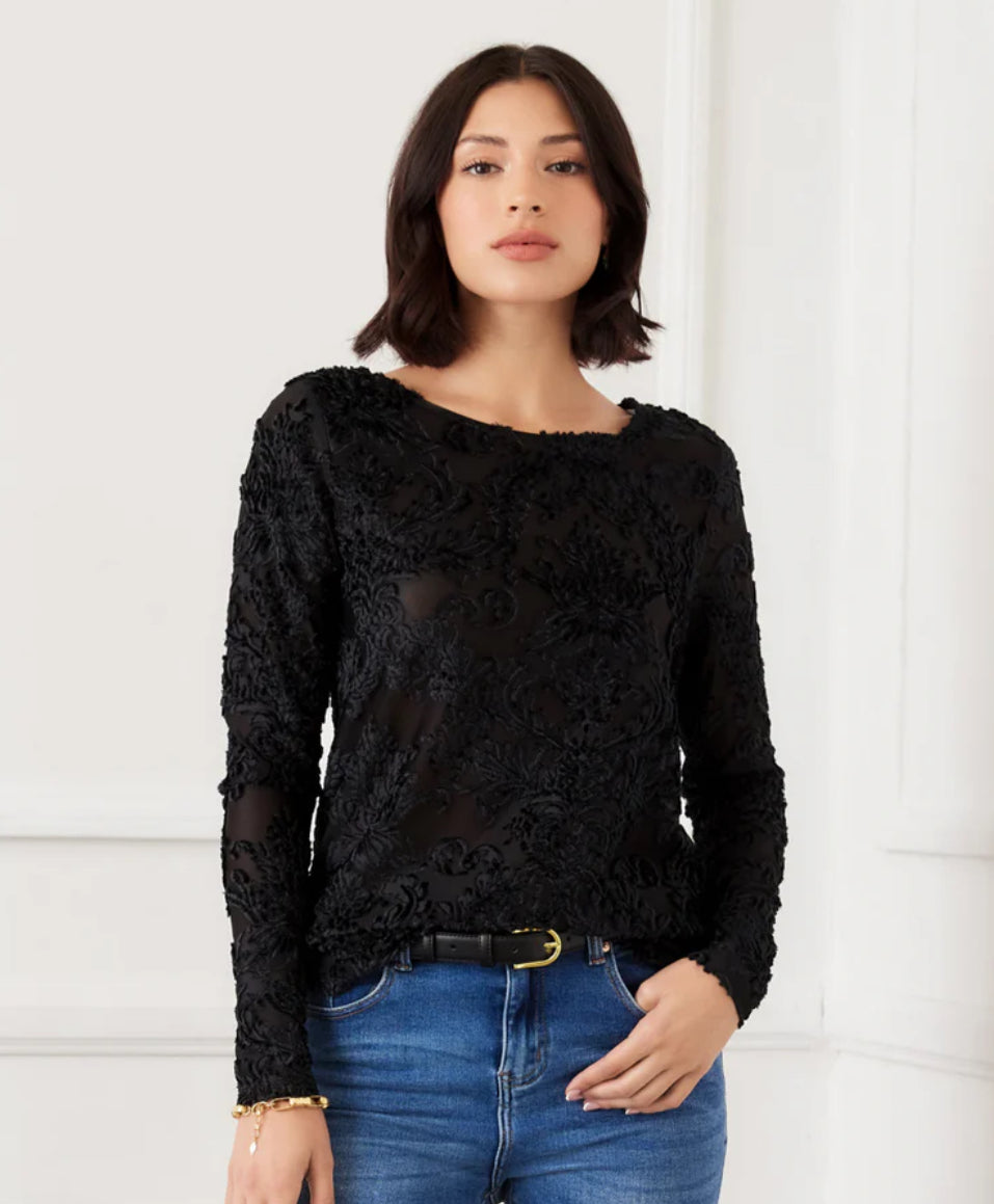 This top is crafted in a velvet jacquard knit that adds rich texture and depth. Designed with classic set-in long sleeves and a refined scoop neckline, the fabric is semi-sheer, giving it a subtly alluring finish. The style is completed with a softly curved shirttail hem, making it easy to wear tucked in or left loose for effortless polish.